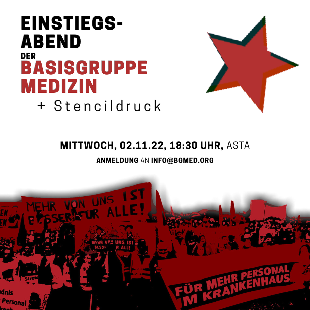 Wir, das ist die Basisgruppe Medizin, eine Hochschulgruppe aus Medizinstudierenden. Wir beleuchten Gesellschaft, Medizin und die Uni aus einer linken Perspektive und vor allem in allen Überschneidungen. So ist unser Motto: Medizin ist eine soziale Wissenschaft! Ihr seid neugierig geworden? Dann kommt zu unserem Einstiegsabend am Mittwoch den 08.11.23 um 19:00 Uhr! 🙂